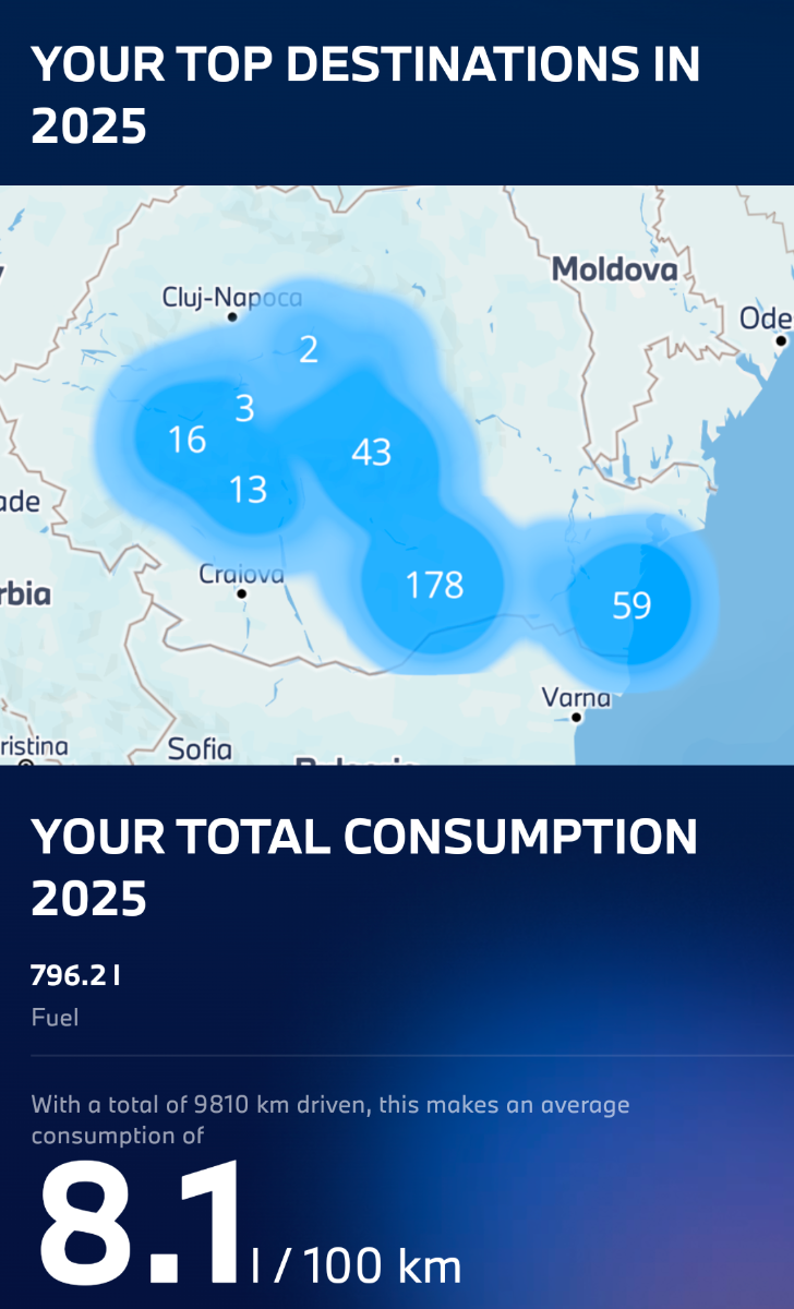 Am atașat in mesaj raportul pe 2025 la modelul pe care il dețin. Mentionez ca mașina a fost incarcata in 2025 de 5,6 ori maxim, intrucat incarcarea la domiciliu n-a fost posibilă anul trecut iar la statii de incarcare nu a meritat. Ce e mai jos deci, este media masinii care in proportie de peste 90% a mers cu "bateria goala".